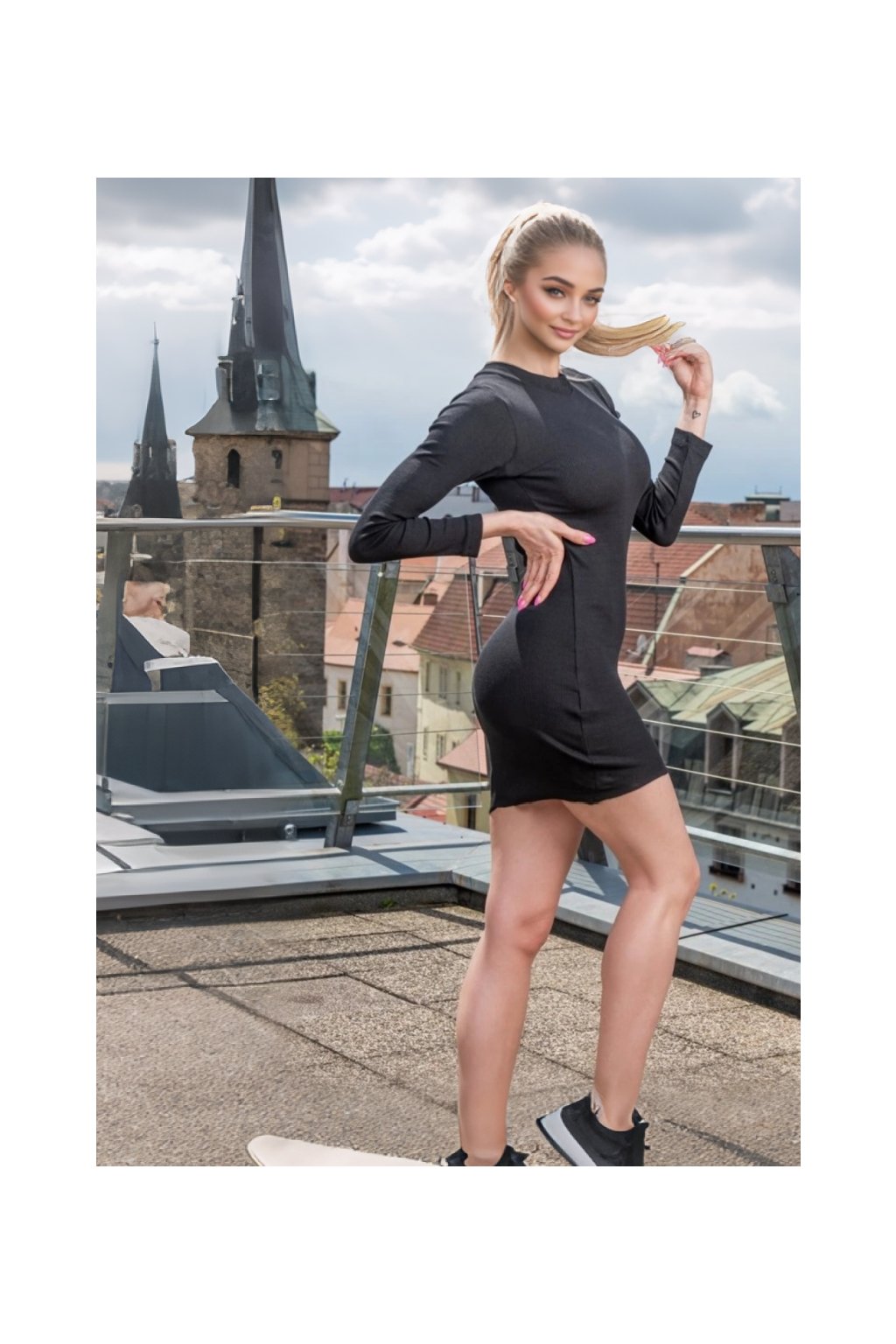 Nádherné dámské šaty v černé barvě. Střih na tělo dokonale zvýrazňuje siluetu postavy, ve spodní části asymetrické. Šaty mají půlkruhový výstřih v oblasti klíčních kostí. Dlouhé rukávy. Délka mini - nad kolena. Vyrobené z příjemného elastického materiálu. Ideální v kombinaci s teniskami či lodičkami.