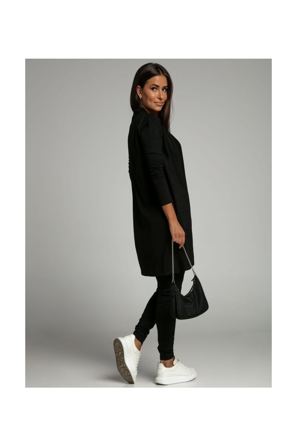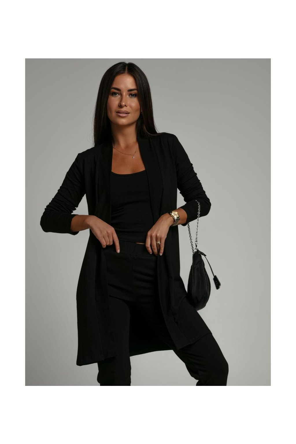 Volný kardigan s dlouhými rukávy, bez zapínání.