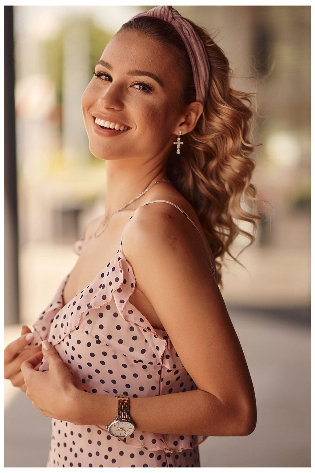 Zwiewna, letnia sukienka w groszki pudrowa. Z dekoltem w serek, na cienkich regulowanych ramiączkach. Zapinana z boku na kryty suwak. Na wysokości biustu delikatne falbanki. Lekko taliowany krój o długości mini. Doskonała na ciepłe letnie dni.