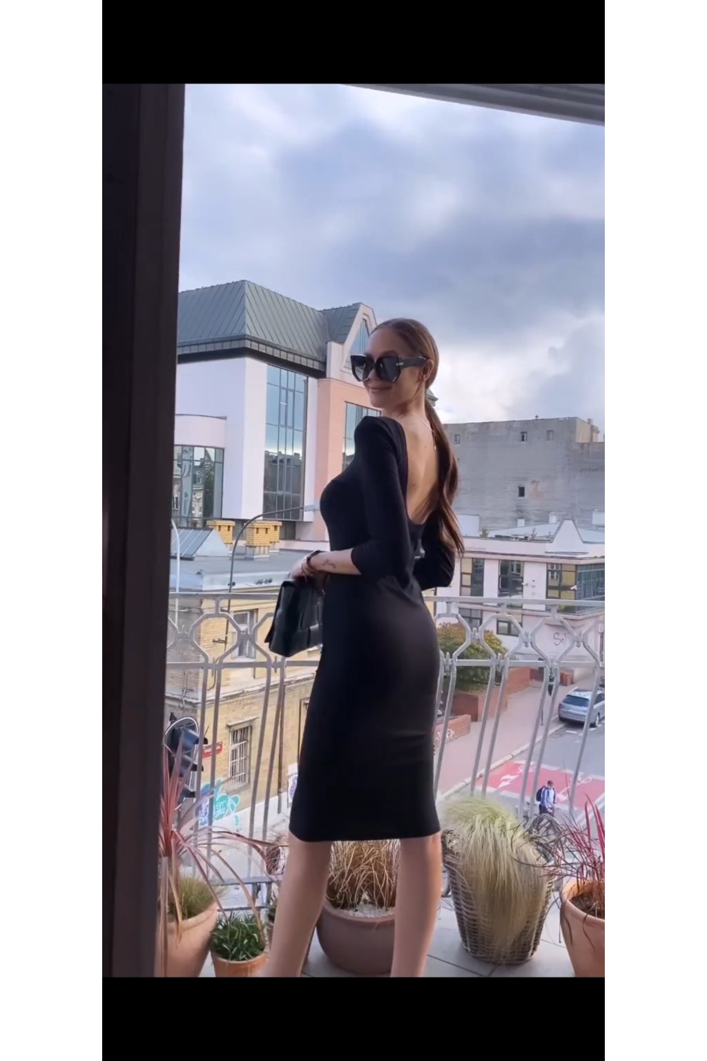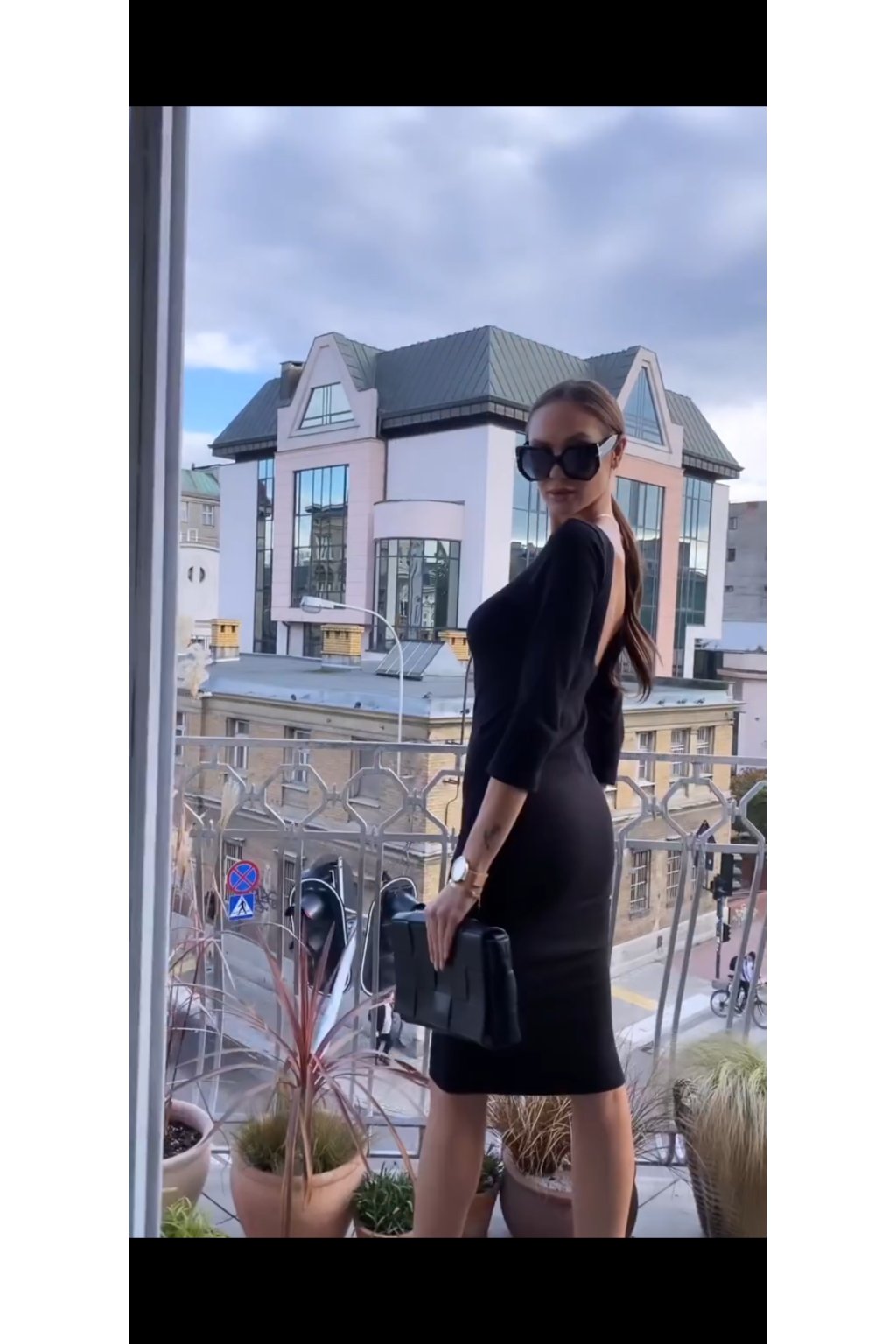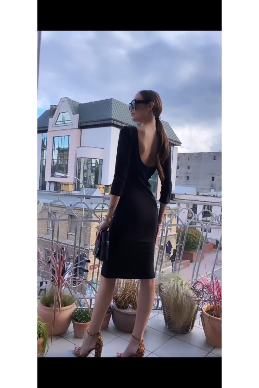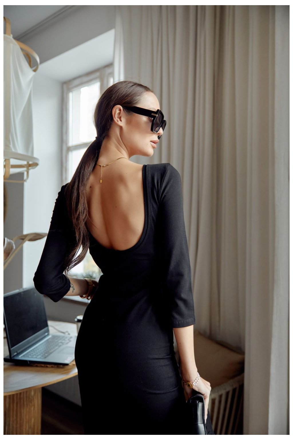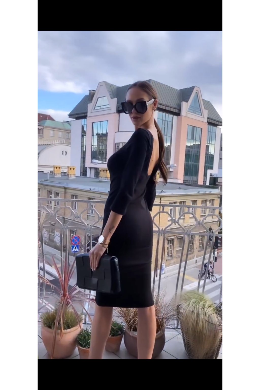 Hluboký výstřih na zádech dodává šatům svůdný nádech, aniž by působil vulgárně.