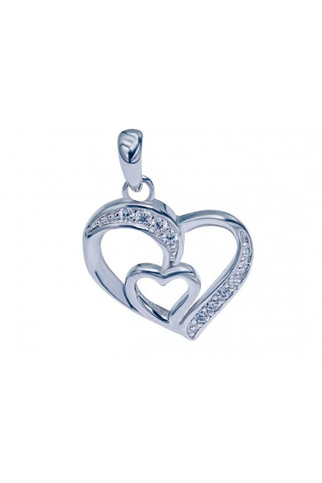 Přívěsek z kvalitního stříbra o ryzosti Ag 925/1000 s příměsí Rhodia - dvě srdce spojené v jedno osázené pomocí sdílených krapen - kapek stříbra - 7 zirkony briliantového brusu.
