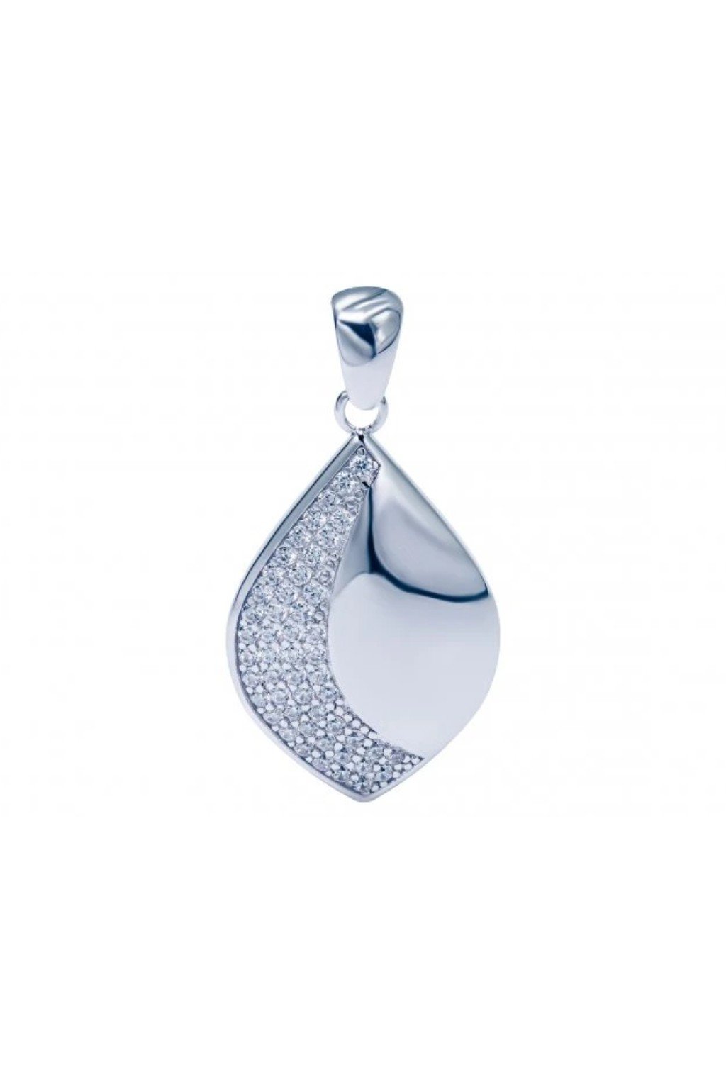 Přívěsek z kvalitního stříbra o ryzosti Ag 925/1000 s příměsí Rhodia - tvar lístku (poupátka) osázeného pomocí hroznového osazení 50 zirkonovými kameny kruhovitého tvaru briliantového brusu, doplněnými o kapky hladkého lesku jemného stříbra.