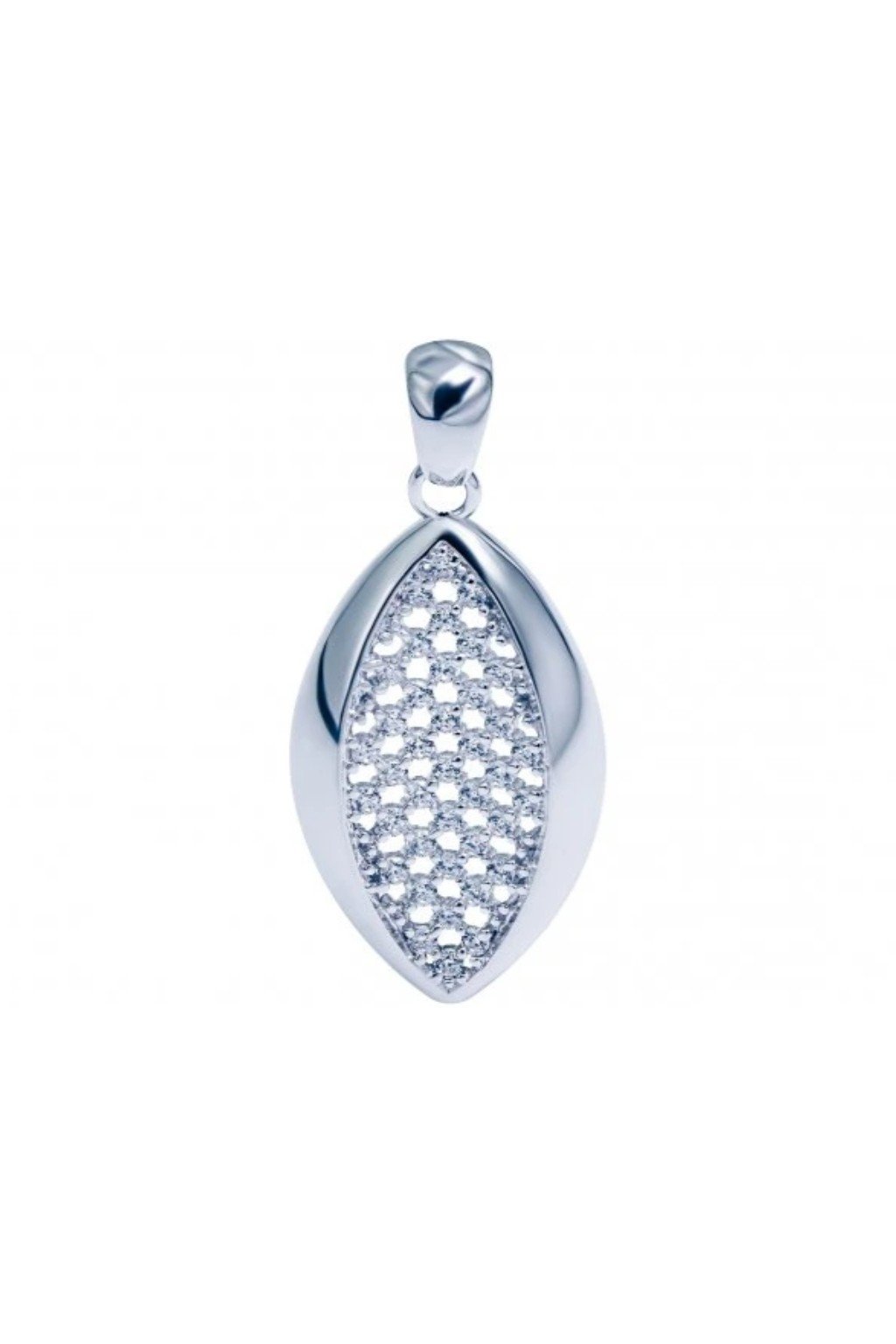 Přívěsek z kvalitního stříbra o ryzosti Ag 925/1000 s příměsí Rhodia - tvar lístku (poupátka) osázeného pomocí hroznového osazení 39 zirkonovými kameny kruhovitého tvaru briliantového brusu.