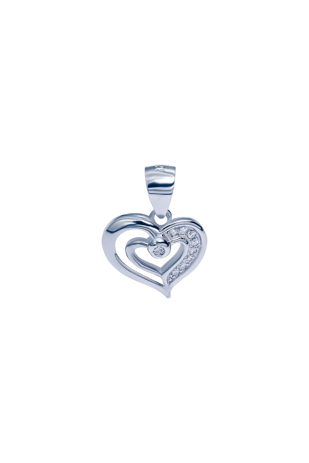 Přívěsek z kvalitního stříbra o ryzosti Ag 925/1000 s příměsí Rhodia - dvě srdce propletené ve vysokém lesku a třpytu pomocí 8 zirkonů - přesně ve středu osázeny pomocí Lunetového osázení kulatým briliantovým zirkonem.