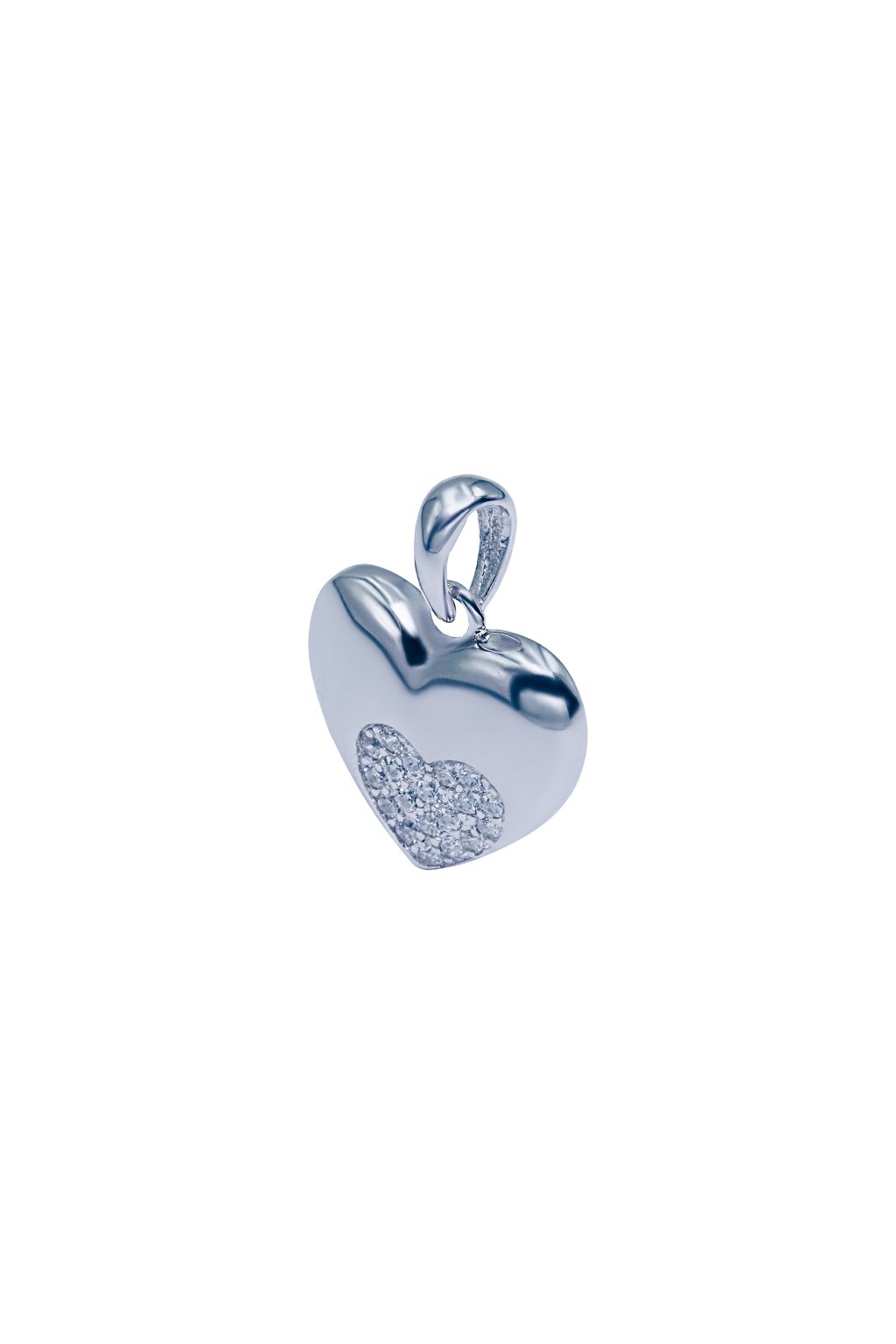Přívěsek z kvalitního stříbra o ryzosti Ag 925/1000 s příměsí Rhodia - dvě srdce smyslnně propojené ve vysokém lesku a třpytu - menší zirkonové srdce, vsazené do většího z hladkého stříbra, osázeno pomocí sdílených krapen - kapek stříbra - hroznovým osazením zirkony kulatého tvaru briliantového brusu.