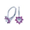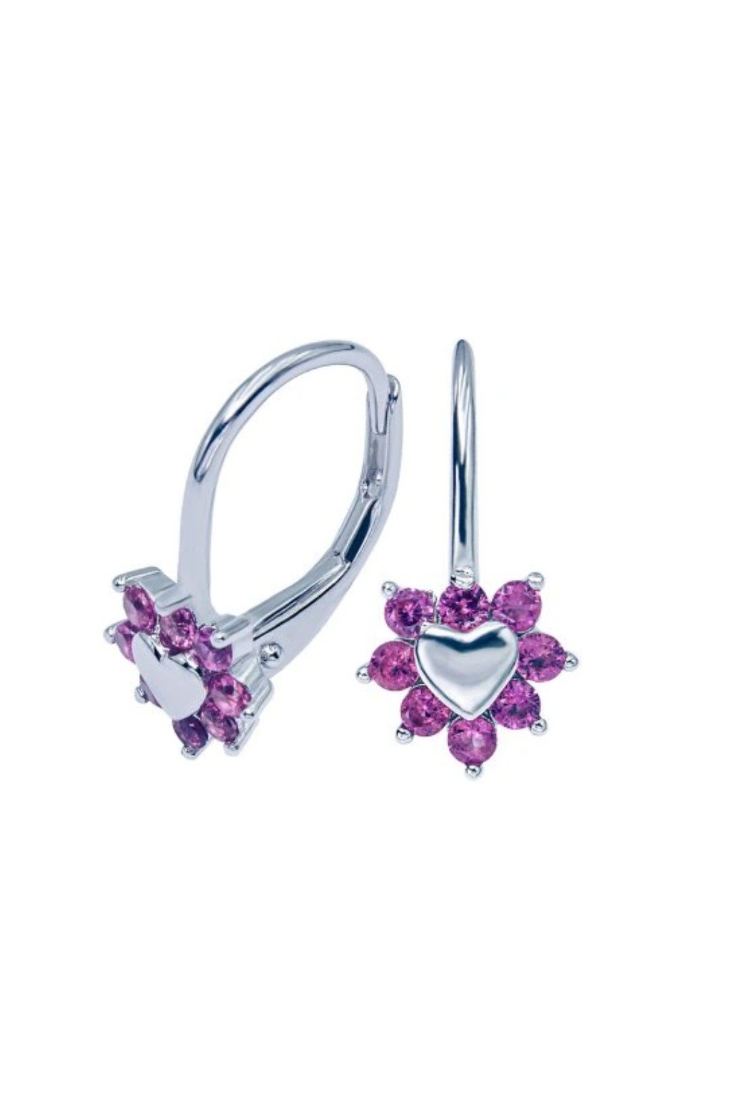 Náušnice z kvalitního stříbra o ryzosti Ag 925/1000 s příměsí Rhodia se středovým srdíčkem jemného stříbra hladkého lesku dokola osázeného pomocí fialkových zirkonů a bezpečně zachyceno pomocí krapen.