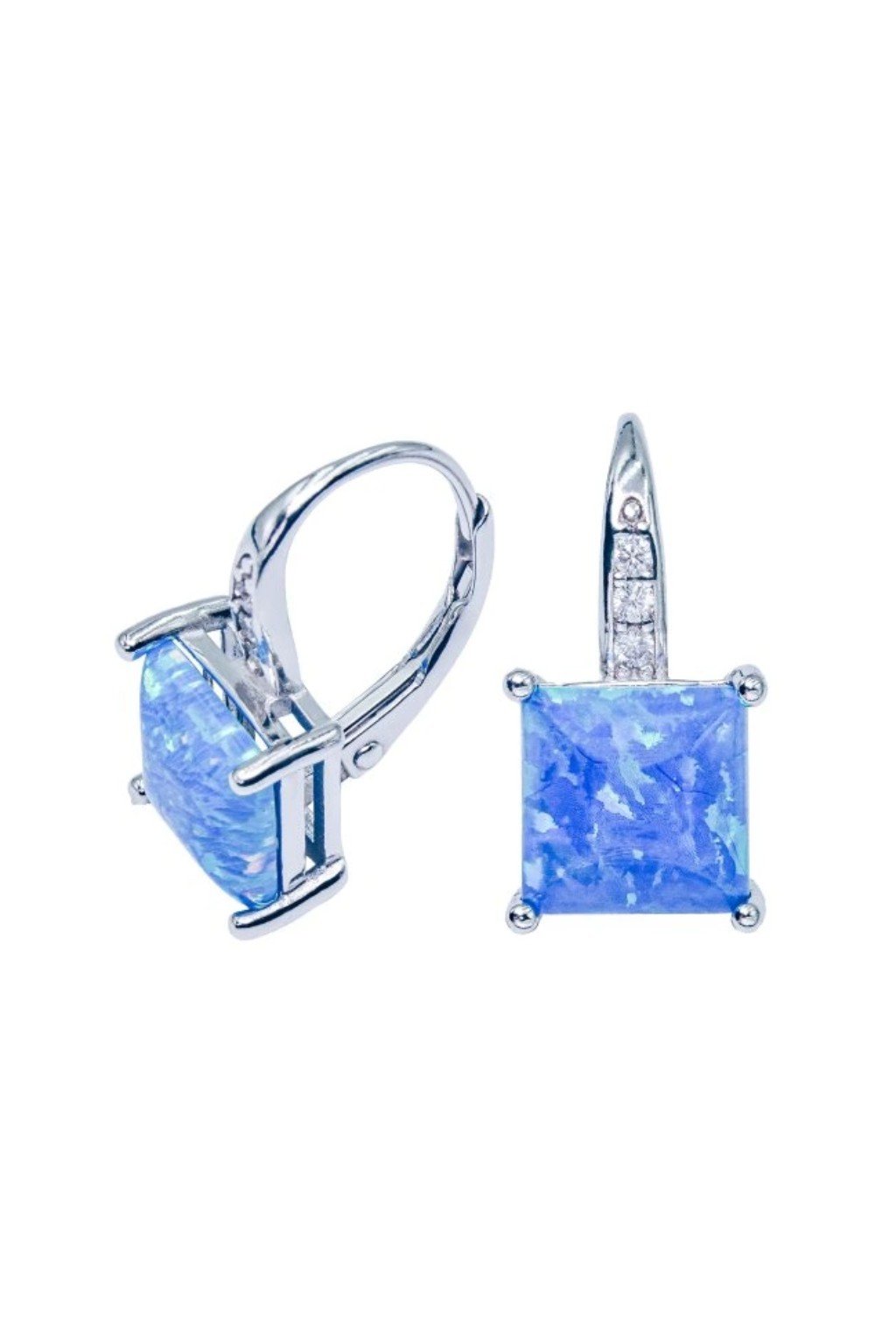 Náušnice z kvalitního stříbra o ryzosti Ag 925/1000 s příměsí Rhodia, osázené pomocí 4 krapen hladkého stříbra dominujícím Opálem mořské modře brusu Princess (7.97x5.38 mm), který si hraje s odlesky menších zirkonů a vytváří tak nezapomenutelnou souhru barev.