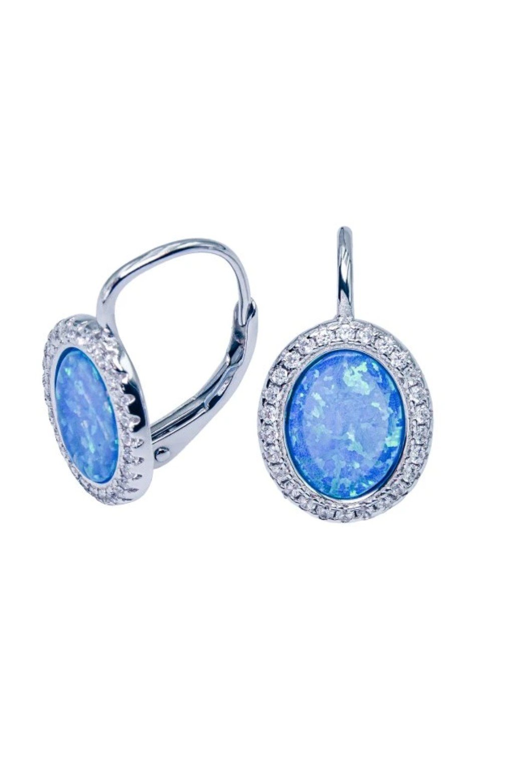 Náušnice z kvalitního stříbra o ryzosti Ag 925/1000 s příměsí Rhodia, osázené sdílenými krapnami 27 kulatými zirkony s dominujícím středovým oválným Opálem odstínu mořské modré, osázeným pomocí Lunety, který si hraje s odlesky menších zirkonů a vytváří tak nezapomenutelnou podívanou.