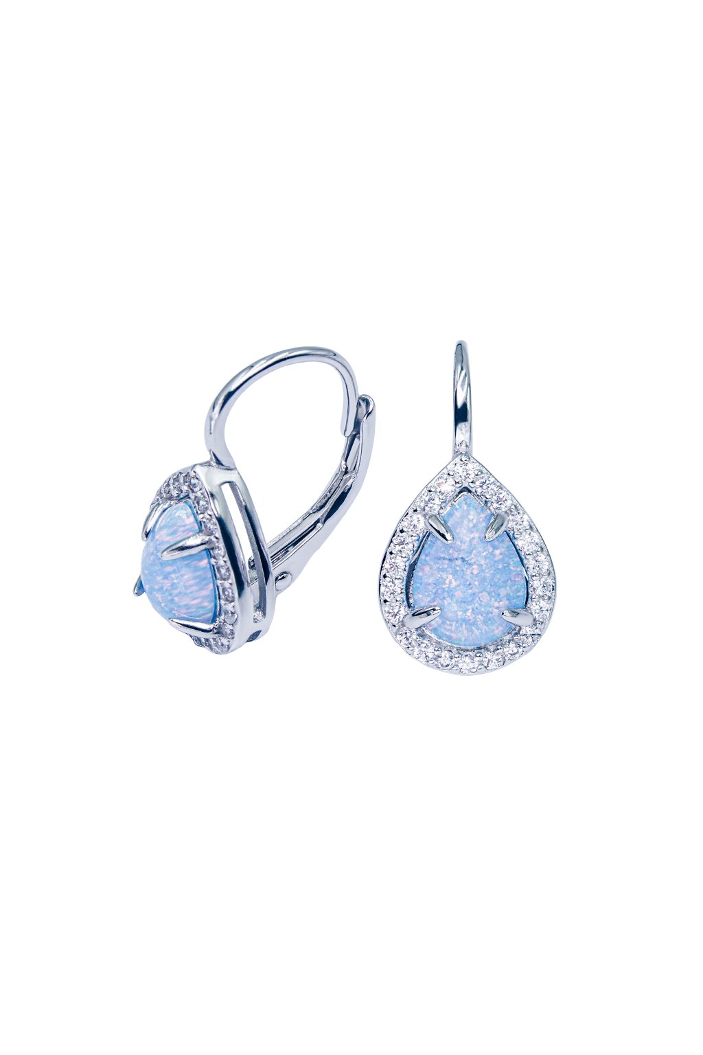 Náušnice z kvalitního stříbra o ryzosti Ag 925/1000 s příměsí Rhodia, osázené kulatými bezbarvými zirkony a modrým opálem "Pear" tvaru a brusu, které si hrají s odlesky hladkého lesku náušnice a vytváří tak nezapomenutelný třpyt a lesk.