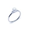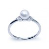Šperk rhodiovaného stříbra hladkého lesku s korunkou osázenou syntetickou perličkou, doplněnou po obvodu těla prstenu o 6 menších zirkonů.