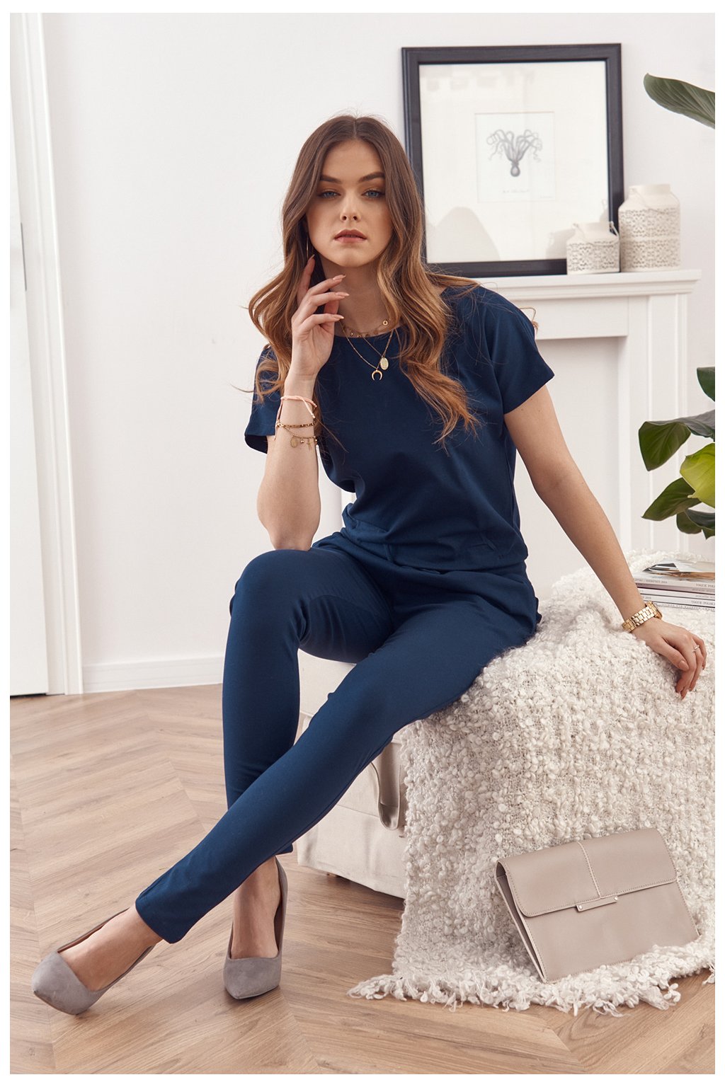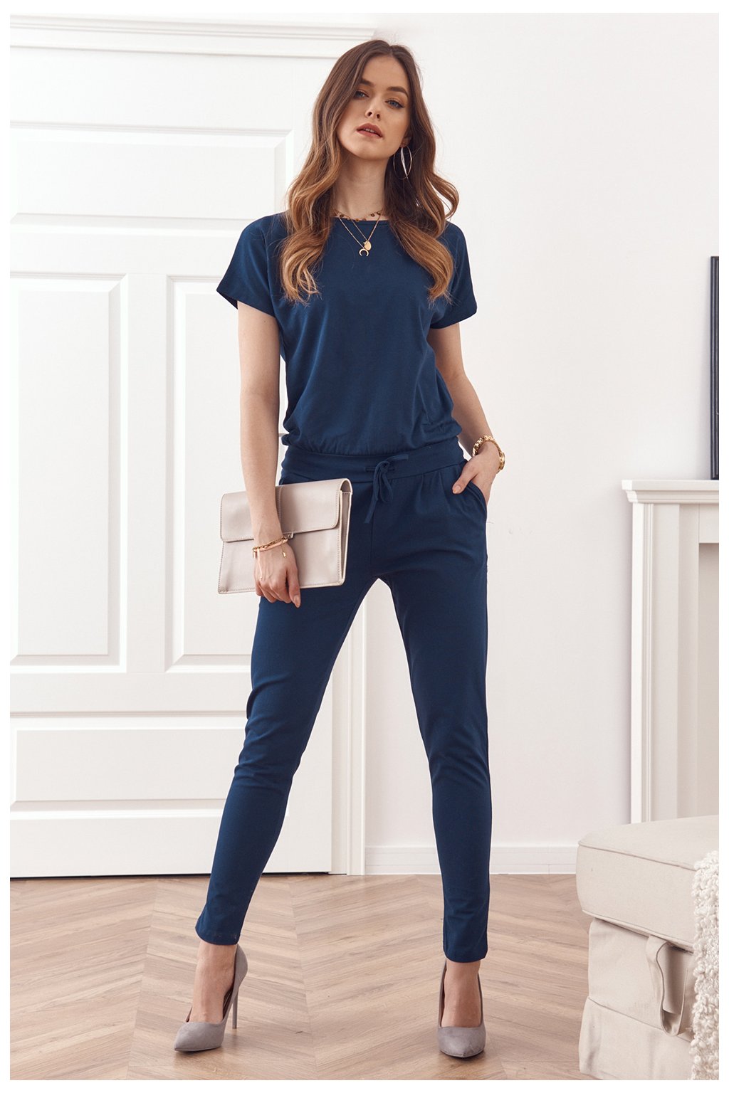Elegantní a zároveň pohodlný dámský overal tmavě modré barvy. Overal s krátkým rukávem, vázáním v pase a lesklou mašlí na zádech.
