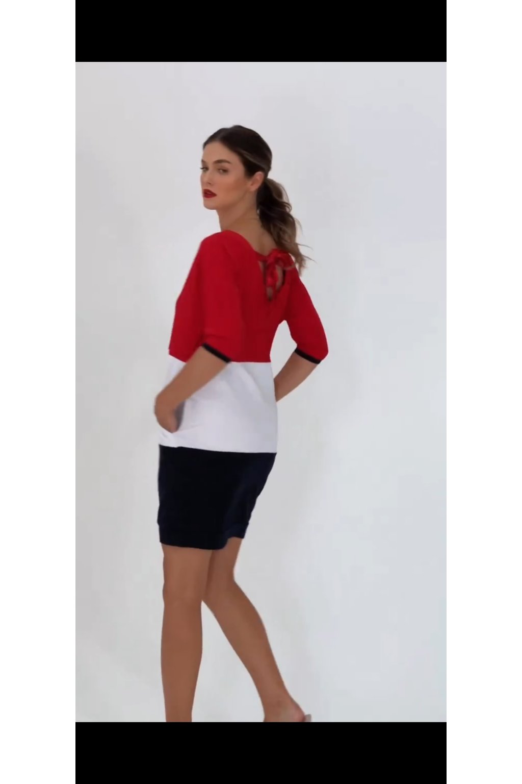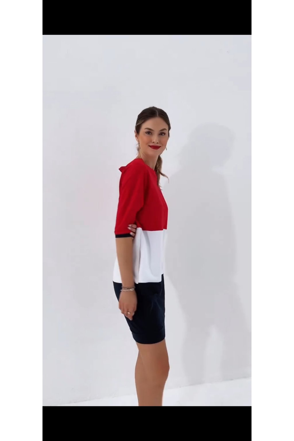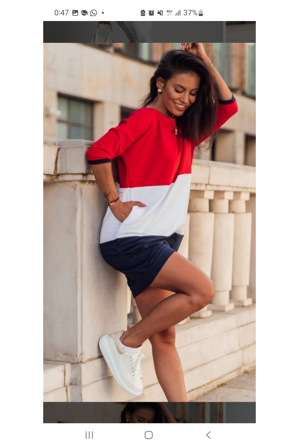 V naší kolekci jsme pro Vás připravili tyto bavlněné, pruhované, trikolorní mini šaty volného střihu, které padnou každému. Šaty mají půlkruhový výstřih vpředu a výstřih do V se zavazováním vzadu. Skvěle vypadají 3/4 dlouhé rukávy zakončené lemy a ozvláštněním na šatech jsou kapsy na bocích. Šaty budou vypadat stylově k teniskám i k lodičkám.