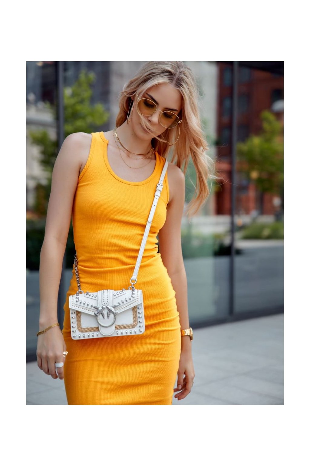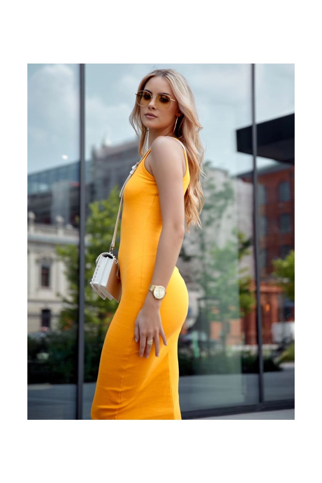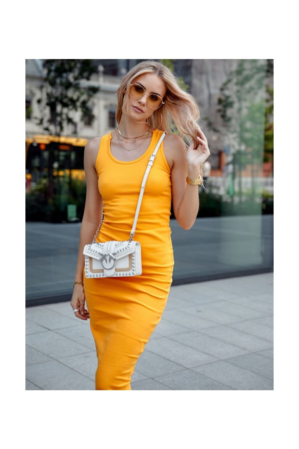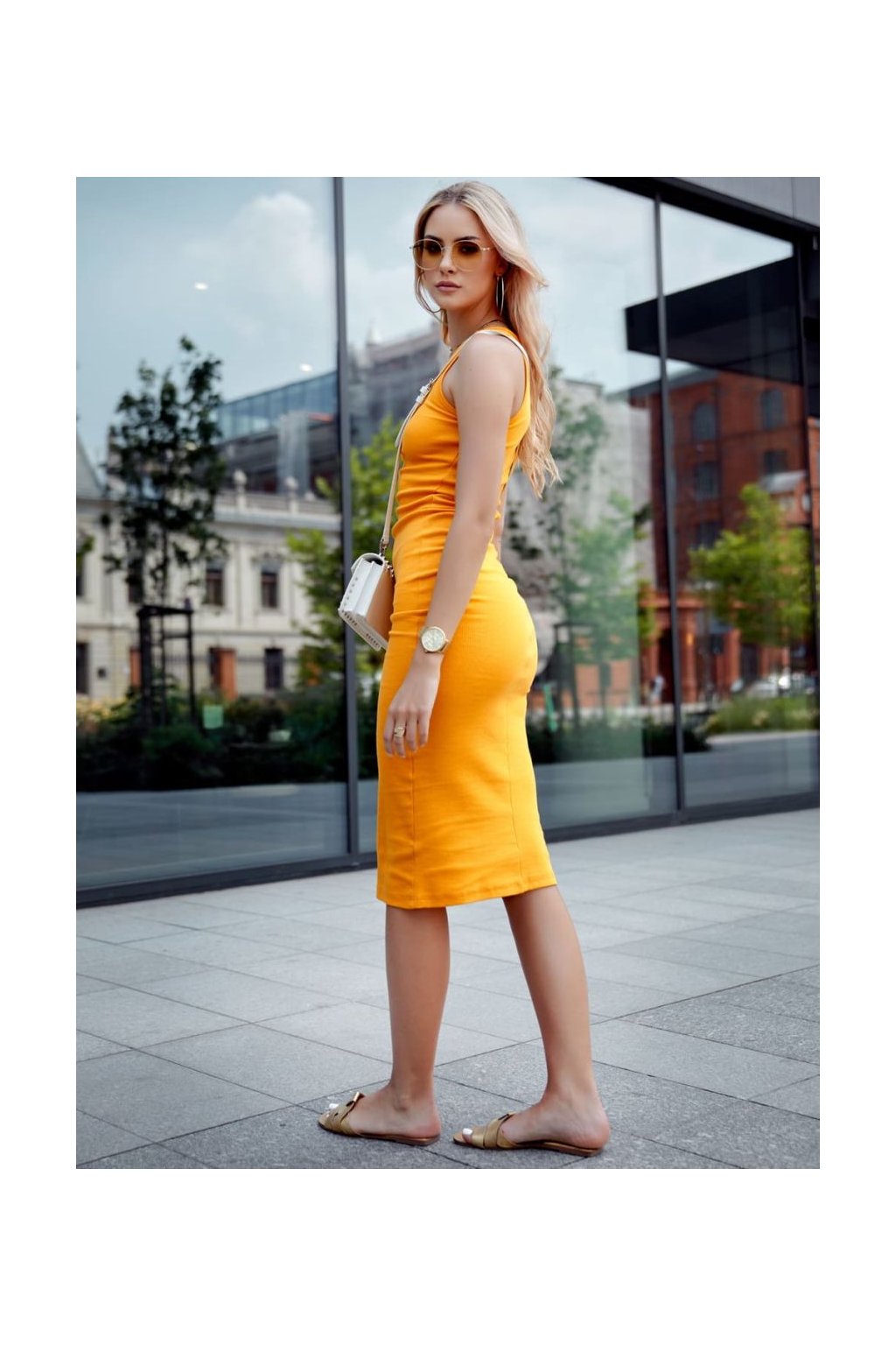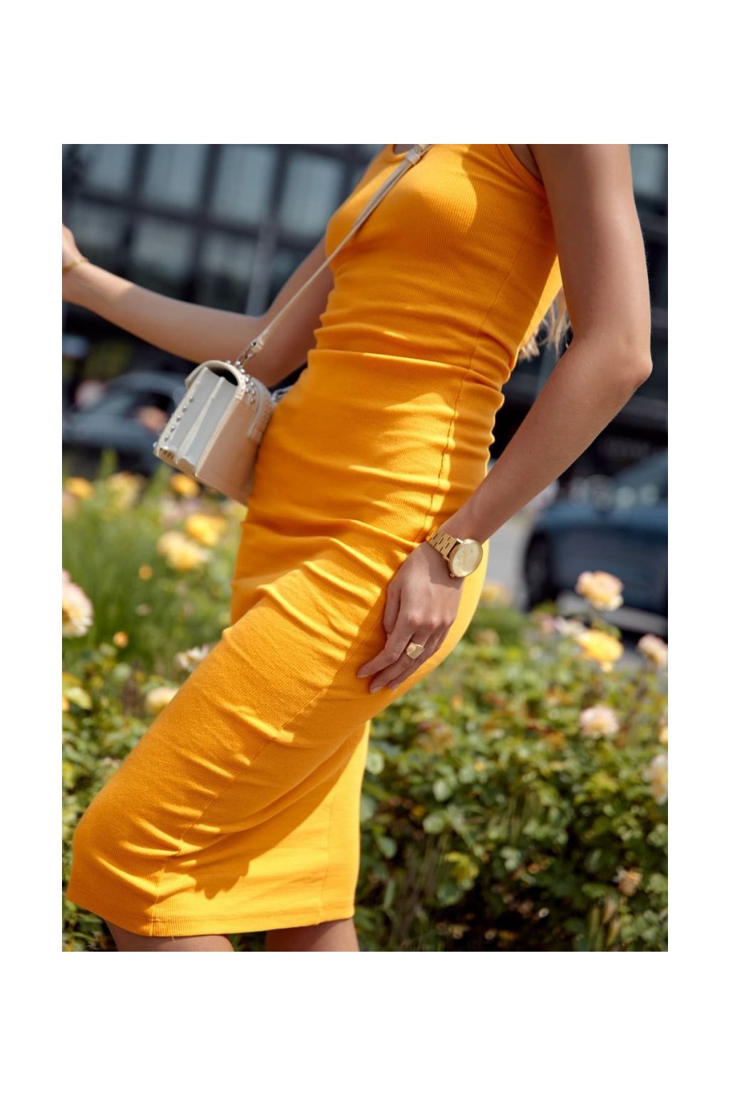 Vypasované midi šaty s ramínky v hořčicově žluté barvě FG666